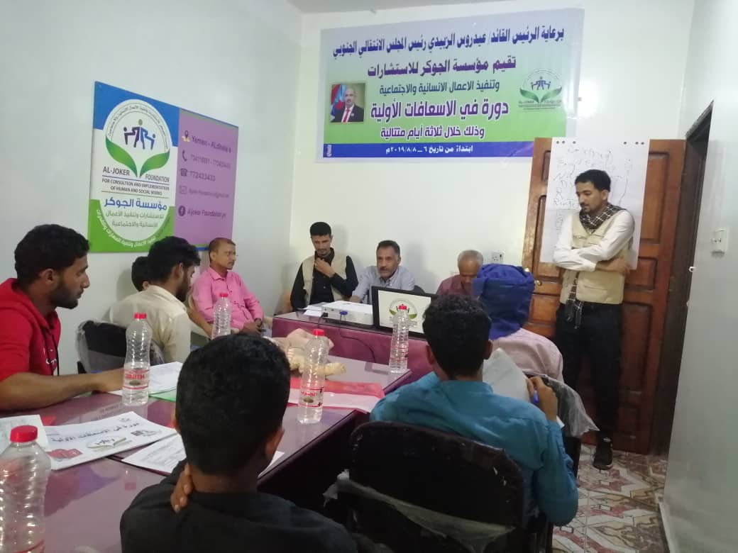 اختتمت مؤسسة الجوكر للاستشارات وتنفيذ الأعمال الإنسانية اليوم الخميس الموافق 8 أغسطس 2019م، فعاليات دورة الإسعافات الأولية التي نفذتها المؤسسة تحت رعاية الرئيس القائد عيدروس الزُبيدي وبحضور رئيس الدائرة الاجتماعية في المجلس الانتقالي الجنوبي بمحافظة الضالع الاستاذ عبدالحميد طالب إلى جانب رئيس المؤسسة الدكتور أمين محمود علي حسن والمدير التنفيذي الاستاذ صلاح محمد قايد ومدرب الدورة الدكتور محمد عبده محمد.