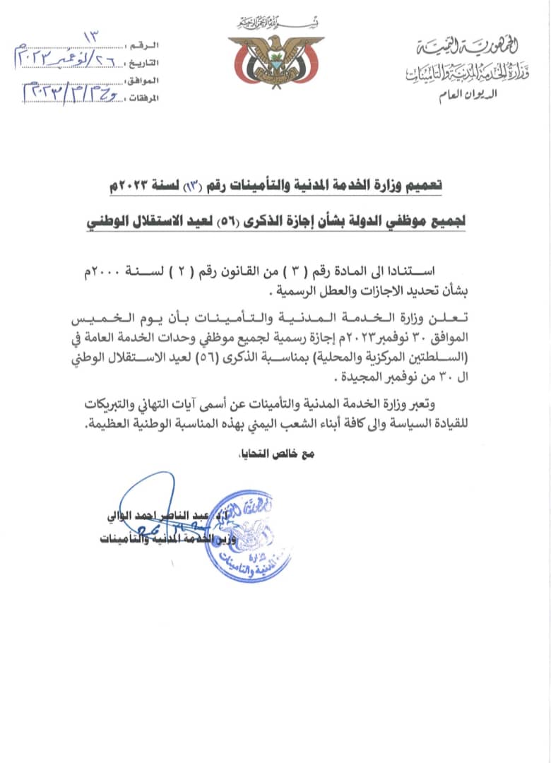 اعلنت وزارة الخدمة المدنية والتأمينات يوم الخميس القادم إجازة رسمية لجميع موظفي وحدات الخدمة العامة في السلطتين المركزية والمحلية بمناسبة الذكرى الـ٥٦ لعيد الاستقلال الوطني الـ٣٠ نوفمبر المجيدة .