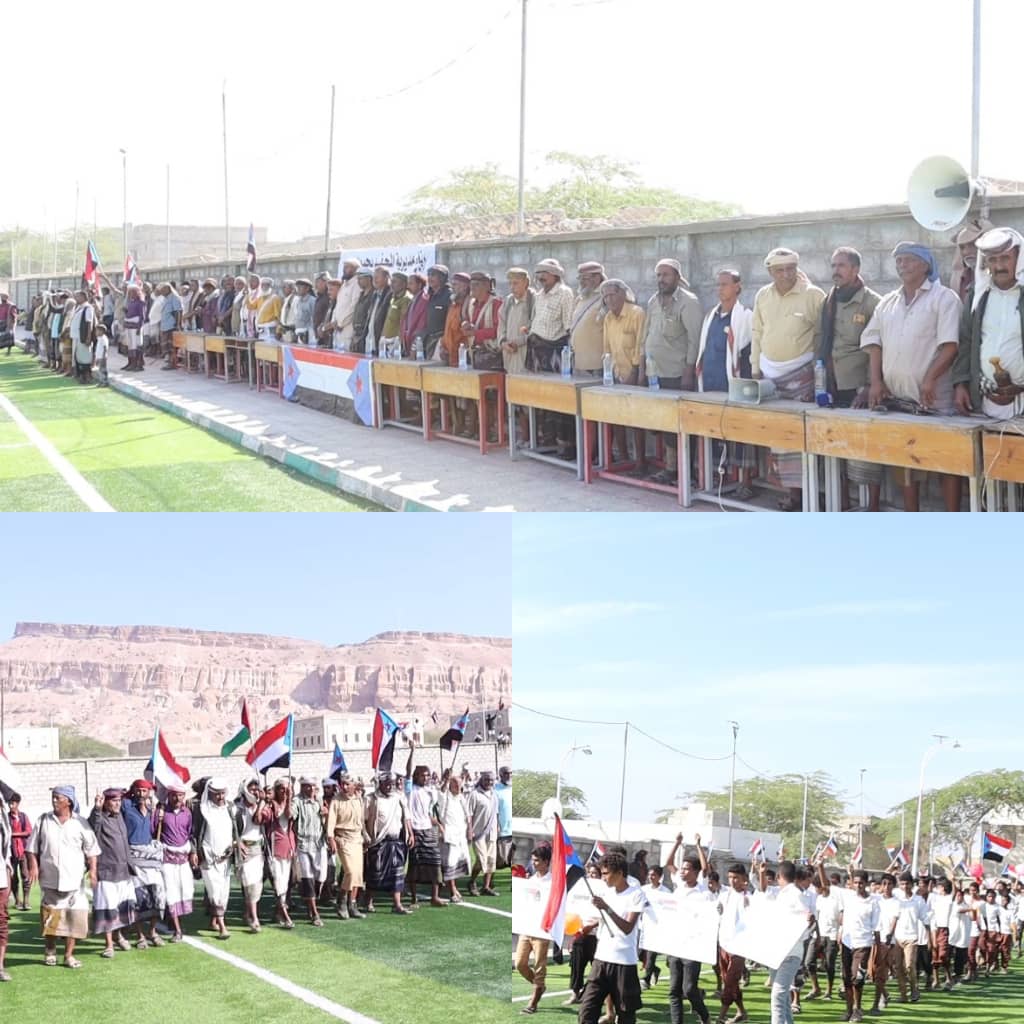 وبعد مسيرة راجلة طافت شوارع المدينة إتجه المتظاهرون إلى ملعب الشهيد لبرق بعاصمة المديرية للوصول إلى المهرجان الخطابي والكرنفالي الذي بدأ بآية من الذكر الحكيم القاها الطالب/عمر مختار عاتق، ثمَّ الإستماع للنشيد الوطني الجنوبي، ثمَّ وقف المشاركين وقفة حداد على أرواح شهداء الجنوب