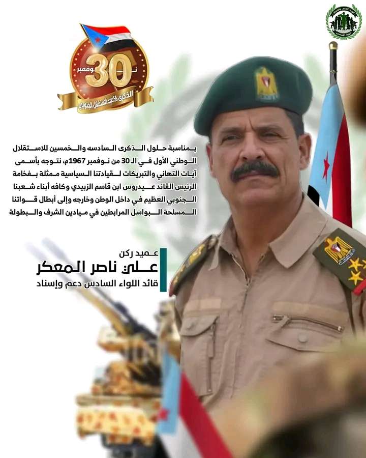 بعثَ العميد ركن /علي ناصر المعكر قائد اللواء السادس دعم واسناد، برقية تهنئة إلى الشعب الجنوبي وقيادته السياسية والعسكرية ممثلة بالرئيس القائد /عيدروس الزُبيدي بمناسبة الذكرى ال56 لعيد الاستقلال ال30 من نوفمبر المجيد .