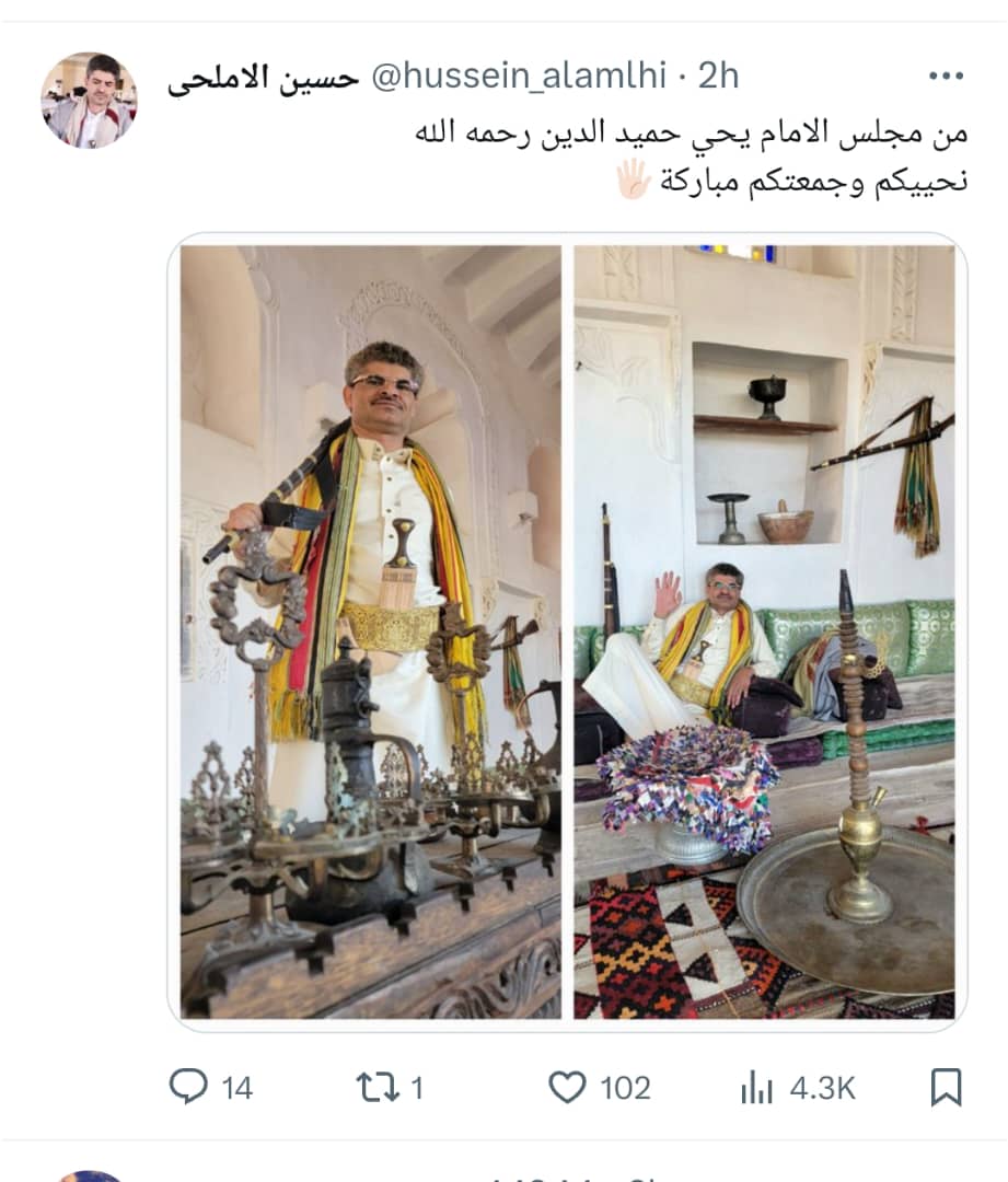 وجه القيادي الحوثي حسين الاملحي رسالة للشعب في صنعاء ومحافظات الشمال الواقعة تحت سيطرة مليشيات الحوثي من خلال صورة التقطها من داخل مجلس الامام يحيى حميد الدين بالعاصمة اليمنية صنعاء مفادها بعودة حكم الإمامة الى عهودهم الاولى الذي كان طبيعة نظام الحكم بمبرر الدين والنسب والفردية المطلقة القائمة على الاستبداد.
