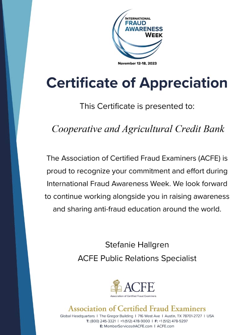 منحت جمعية فاحصي الاحتيال المعتمدين الأمريكية Association of Certified Fraud Examiners شهادة تقدير لكاك بنك لجهوده في المشاركة بفعالية الأسبوع العالمي للتوعية ضد الاحتيال المتميز الذي يهدف الى نشر التوعية حول العالم.