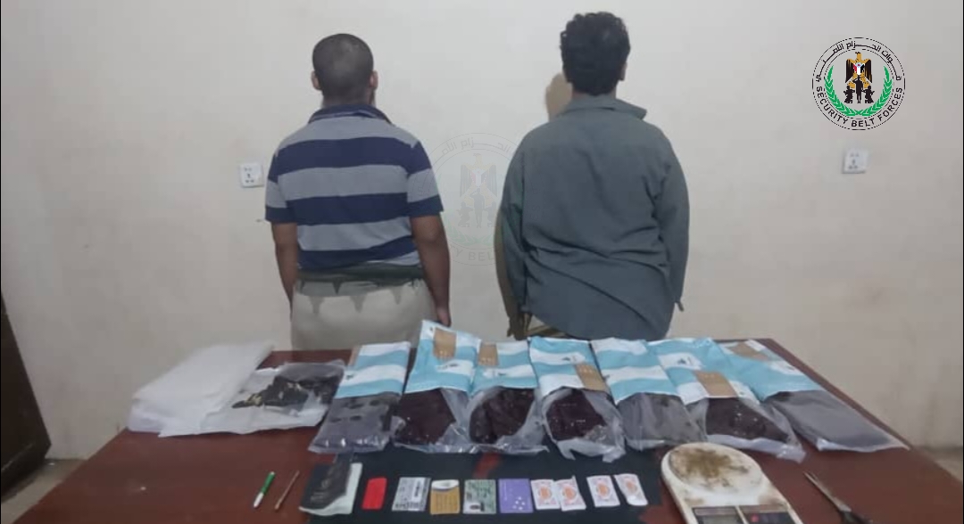 الحزام الأمني بعدن يضبط شخصين بحوزتهما 7 كيلو جرام ونصف من مادة الحشيش المخدر