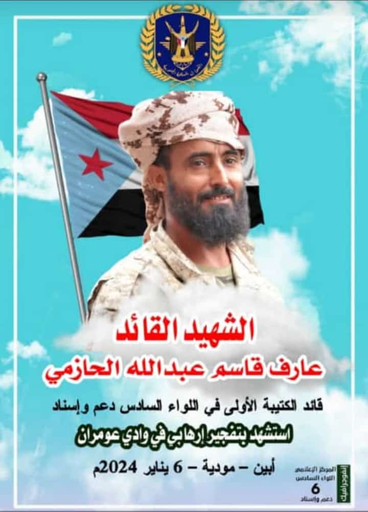 وعلى إثر استشهادهم في عبوة ناسفة من قبل قوى الشر والارهاب تنظيم القاعدة، وهم يؤدوا الواجب بمديرية مودية محافظة ابين،وبناء عليه أتقدم بأصدق التعازي والمواساة لعائلة الشهدا وكل اهلهم ومحبيهم راجيا من المولى عز و جلّ أن يتغمدوهم اروحهم بواسع الرحمة والغفران و أن يسكنه فسيح جنات الرضوان، جوار الشهداء والصديقين والصالحين ويلهم أهلهم جميل الصبر السلوان.