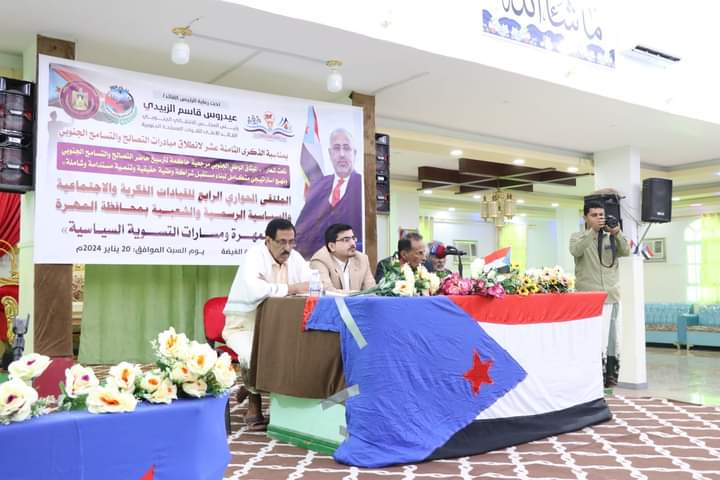 برعاية الرئيس القائد عيدروس قاسم الزبيدي رئيس للمجلس الانتقالي الجنوبي القائد الاعلى للقوات المسلحة الجنوبية وبمناسبة الذكرى ال 18 لمبادرات التصالح والتسامح الجنوبي ،تحت شعار : “الميثاق الوطني الجنوبي مرجعية حاكمة لترسيخ حاضر التصالح و التسامح الجنوبي ، ونهج استراتيجي متكامل لبناء مستقبل شراكة وطنية حقيقة و تنمية شاملة و مستدامة” نظمت الهيئة التنفيذية للقيادة المحلية للمجلس الانتقالي الجنوبي في محافظة المهرة، اليوم السبت الموافق 20 يناير 2024م الملتقى الحواري الرابع للقيادات السياسة الرسمية والاجتماعية و الشعبية حول “المهرة ومسارات التسوية السياسية”