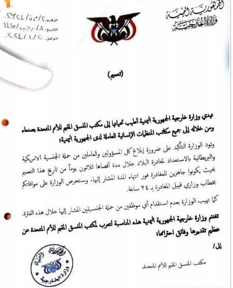 ووجهت الوثيقة مكتب المنسق المقيم للأمم المتحدة بصنعاء اليمنية وجميع مكاتب المنظمات الانسانية العاملة بصنعاء بضرورة مغادرة جميع المسئولين والعاملين ممن يحملون الجنسيات الأمريكية والبريطانية مناطق سيطرتهم خلال مدة أقصاها شهرا.