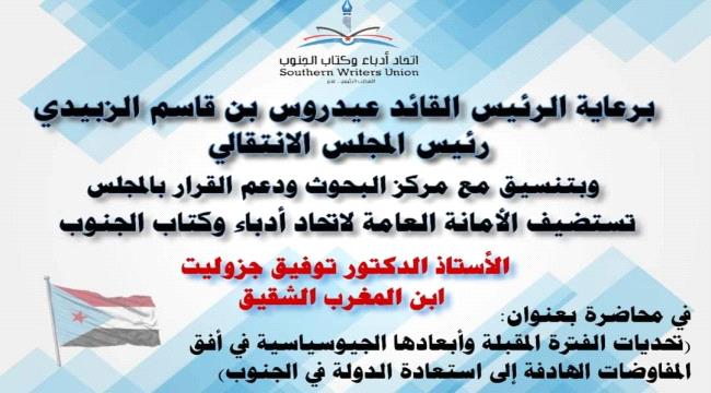 تستضيف الأمانة العام لاتحاد أدباء وكتاب الجنوب /الأستاذ الدكتور توفيق جزوليت ابن المغرب الشقيق، وذلك برعاية كريمة من الرئيس القائد عيدروس بن قاسم الزُبيدي، رئيس المجلس الانتقالي، وبالتنسيق مع مركز البحوث ودعم القرار بالمجلس الانتقالي.