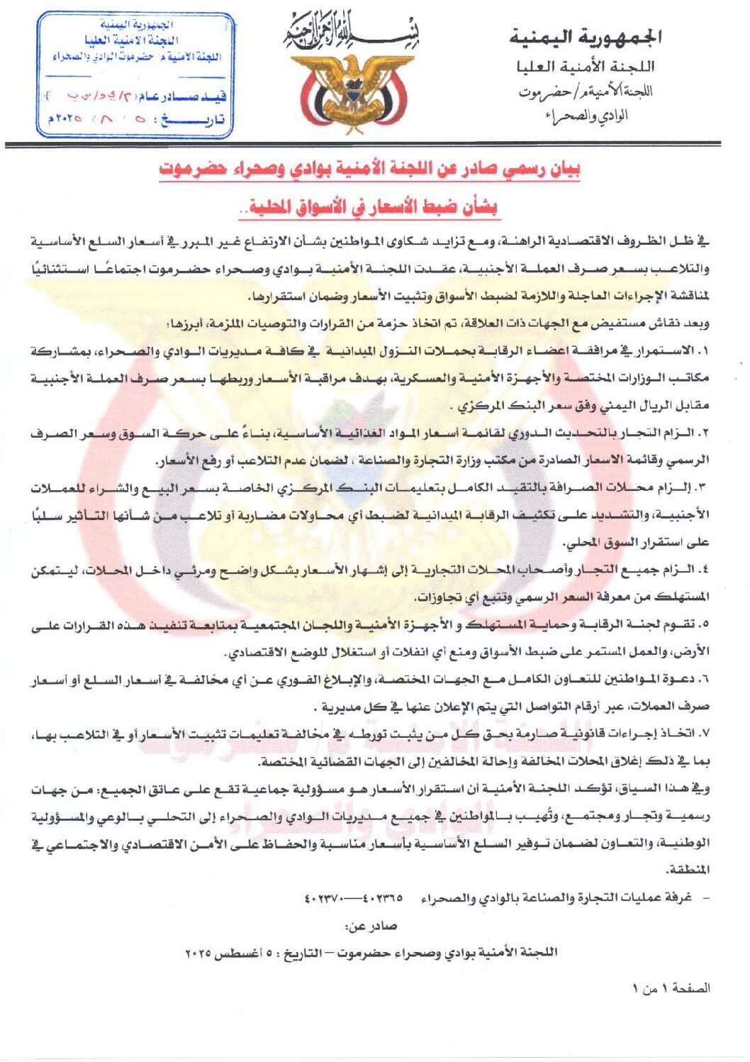 أصدرت اللجنة الأمنية بوادي وصحراء حضرموت بيان هام يتعلق بالإجراءات العاجلة واللازم اتخاذها لضبط الأسواق وتثبيت الأسعار وضمان استقرارها.