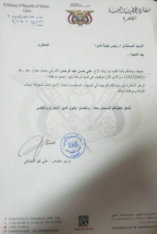 ووجهت السفارة لدى القاهره خطابا رسميا الى رئيس نيابة شبرا تدعوه التوجيه إلى الجهات المختصة باتخاذ الإجراءات لمعرفة أسباب وفاة