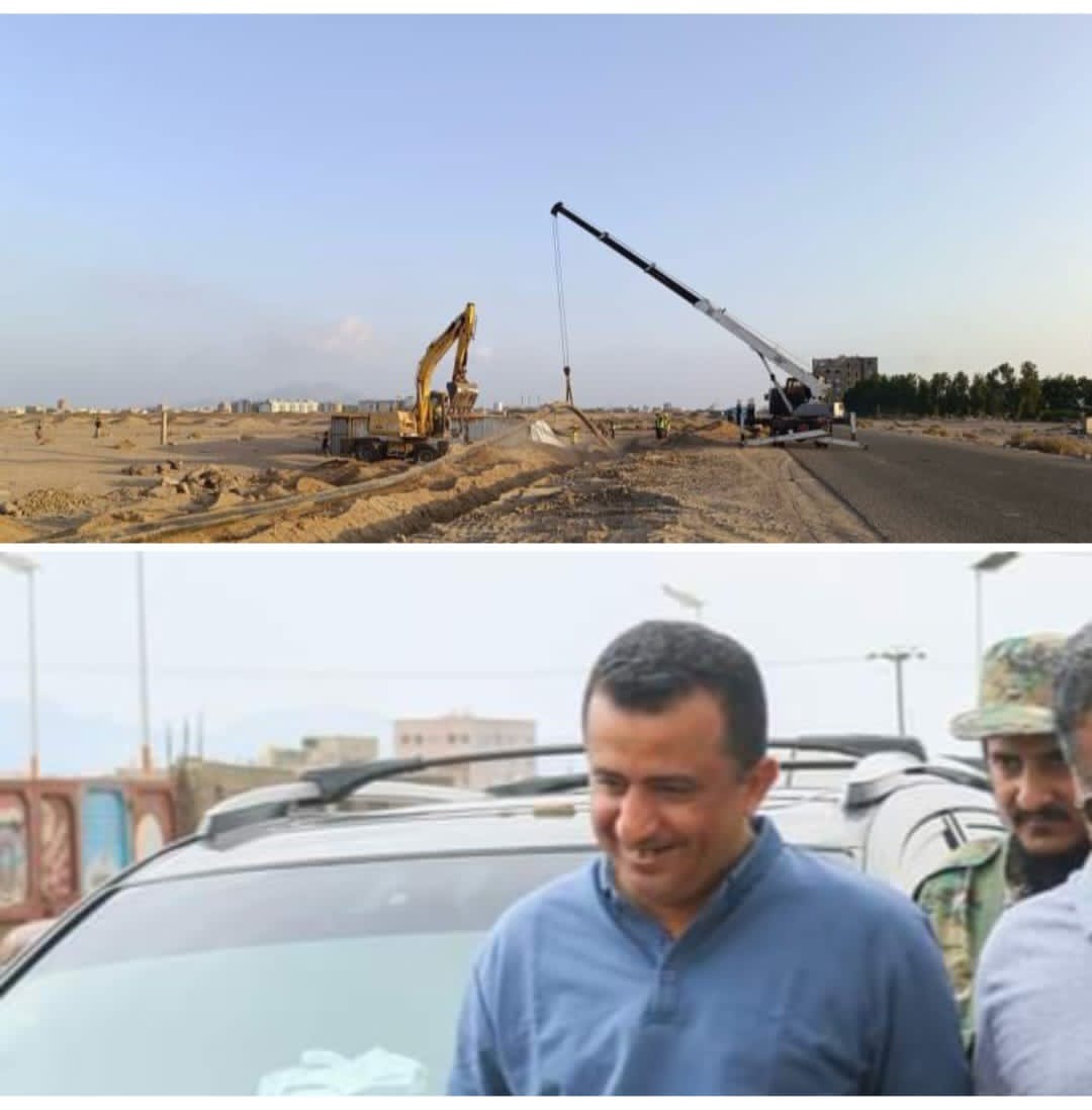 فيما جهاز فحص اختبار تشغيل محطة الرئيس يصل عدن… الوليدي يتفقد سير أعمال تركيب خطوط التصريف لمحطة الطاقة الشمسية