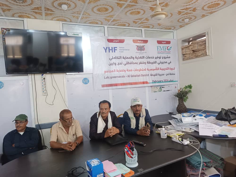 دشن الاستاذ عماد احمد غانم مدير عام مديرية كرش القبيطة ومعه الدكتور محمد سعيد جازم مدير مكتب الصحة والسكان بالمديرية والدكتور لؤي عبدالحكيم عبدالرب المنسق الميداني للجهة المنفذة المؤسسة الطبية الميدانية اليوم بقاعة مستشفى ابن خلدون بحوطة لحج الدورة التدريبية لمتطوعات صحة وتغذية المجتمع بمناطق