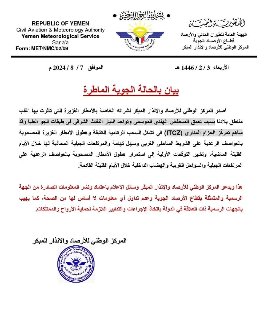 أصدر المركز الوطني للأرصاد والإنذار المبكر نشراته الخاصة بالأمطار الغزيرة التي تأثرت بها أغلب مناطق بلادنا بسبب تعمق المنخفض الهندي الموسمي وتواجد التيار النفاث الشرقي في طبقات الجو العليا وقد ساهم تمركُز الحزام المداري (ITCZ) في تشكل السحب الركامية الكثيفة وهطول الأمطار الغزيرة المصحوبة بالعواصف الرعدية على الشريط الساحلي الغربي وسهل تهامة والمرتفعات الجبلية المحاذية لها خلال الأيام القليلة الماضية، وتشير التوقعات الأولية إلى استمرار هطول الأمطار المصحوبة بالعواصف الرعدية على المرتفعات الجبلية والسواحل الغربية والهضاب الداخلية خلال الأيام القليلة القادمة.
