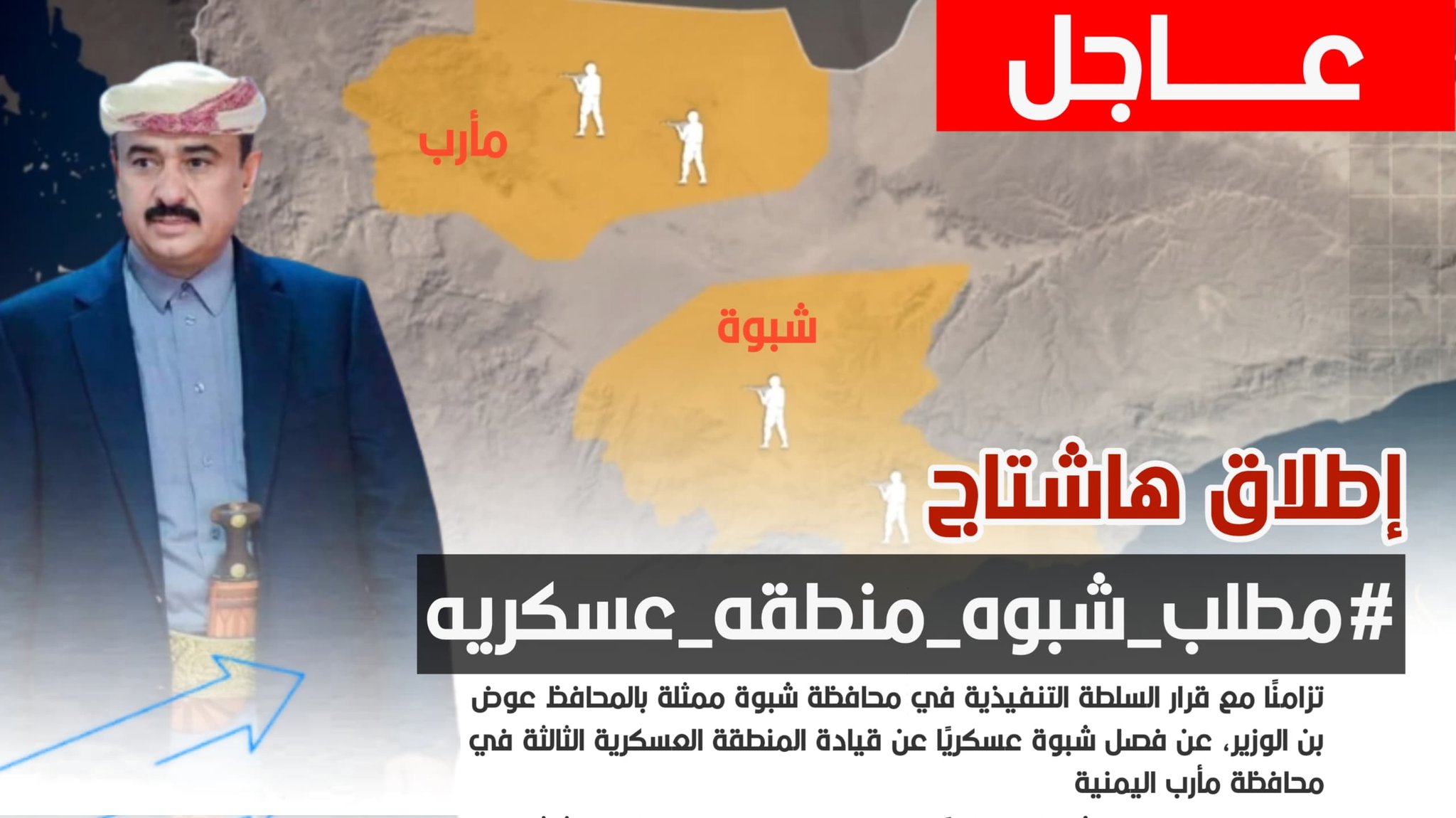 أطلق ناشطون ومواطنون من محافظة شبوة والجنوب حملة على مواقع التواصل الاجتماعي تحت هاشتاج #مطلب_شبوه_منطقه_عسكريه للمطالبة بإنشاء منطقة عسكرية مستقلة عن مأرب.