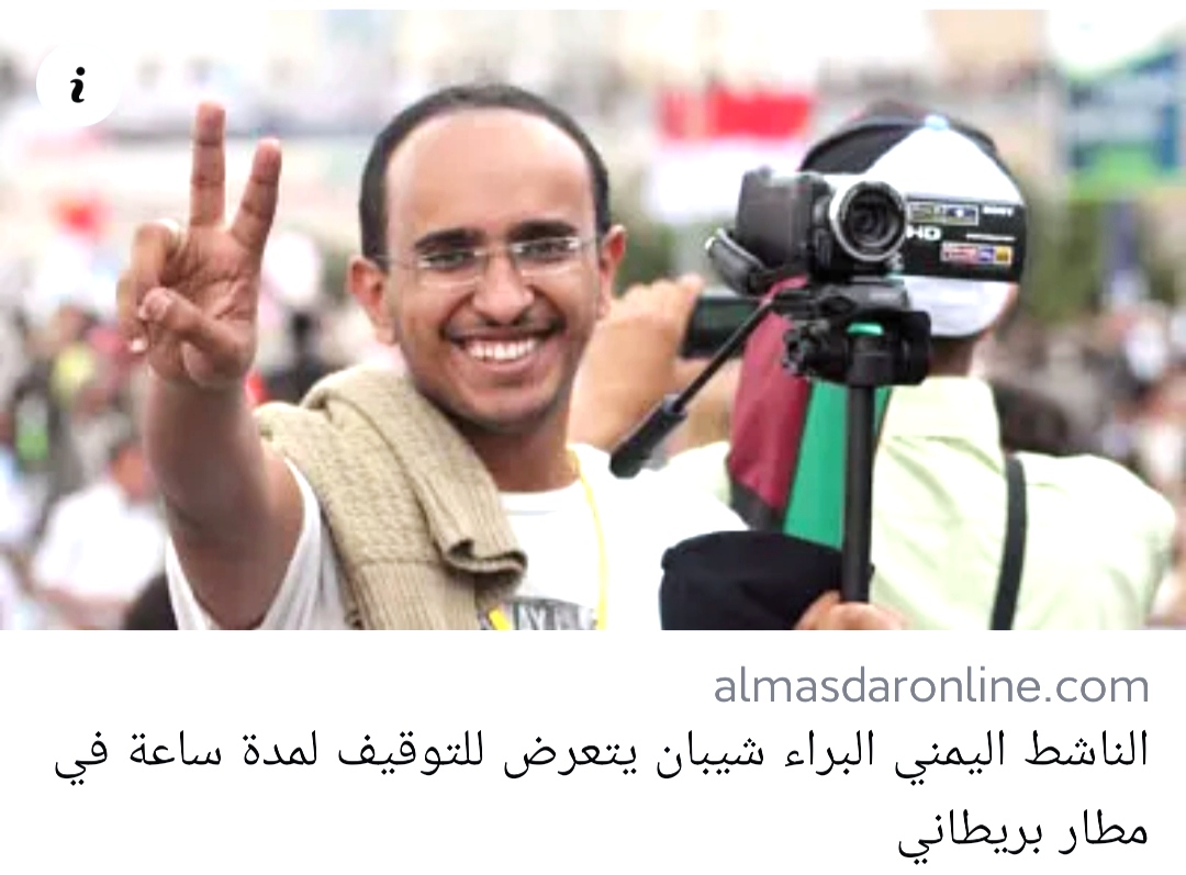 وتابعت المصادر بان براء شيبان بعد عشرة أيام بالتمام و الكمال سافر سرا إلى بريطانياً ،ولم يعرف عنه شيئا حتى ظهر في صفحته الشخصية ( فيس بوك) وهو يتحدث عن اعتقاله في مطار غاتويك بلندن لمدة ساعة ونصف والى تفاصيل منشوره: احتُجِز الناشط الحقوقي اليمني البراء شيبان في مطار غاتويك بلندن لمدة ساعة ونصف وجرى استجوابه بخصوص عمله وآرائه السياسية من قبل المسؤولين في المملكة المتحدة بموجب قانون مكافحة «الإرهاب».