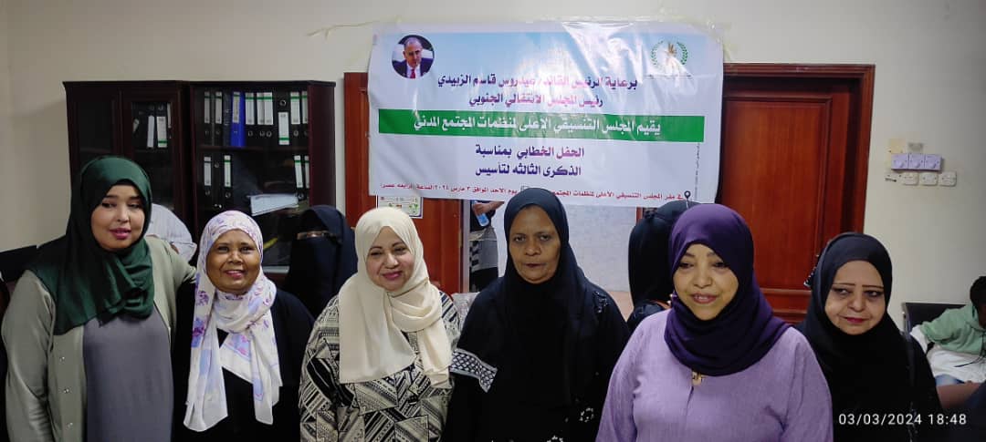 برعاية الرئيس القائد عيدروس الزبيدي رئيس المجلس الانتقالي الجنوبي أقام المجلس التنسيقي الاعلى لمنظمات المجتمع المدني بالعاصمة عدن فعالية احتفالية بالذكرى السنوية الثالثة لتأسيسه .