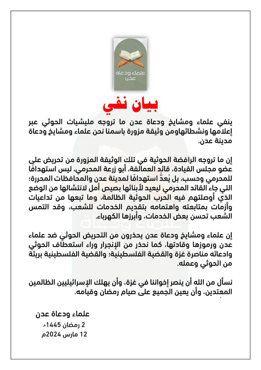 ينفي علماء ومشايخ ودعاة عدن ما تروجه مليشيات الحوثي عبر إعلامها ونشطائهاومن وثيقة مزورة باسمنا نحن علماء ومشايخ ودعاةمدينة عدن.