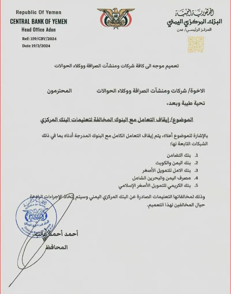 وجه البنك المركزي اليوم تعميما الى كافة البنوك وشركات ومنشآت الصرافة ووكلاء الحوالات ينص على إيقاف التعامل الكامل مع البنوك المخالفة لتعليمات البنك المركزي بما في ذلك الشبكات التابعة لها والبنوك هي: