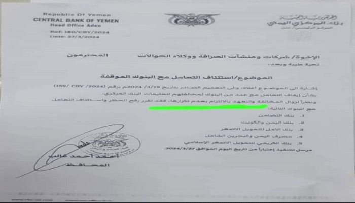 وكان البنك المركزي في عدن وجه بوقف التعامل مع كلا من بنك التضامن، وبنك اليمن والكويت، وبنك الامل للتمويل الأصغر، ومصرف اليمن والبحرين الشامل، وبنك الكريمي للتمويل الاصغر الإسلامي.
