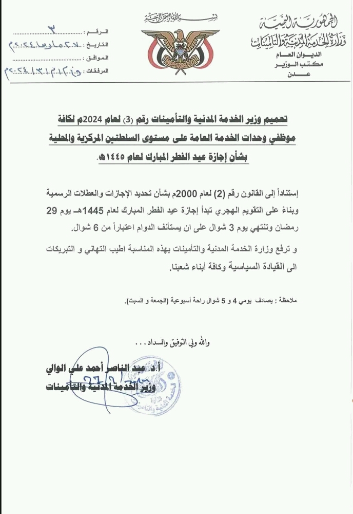 الخدمة المدنية تحدد إجازة عيد الفطر المبارك
