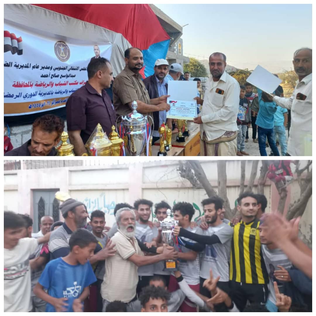 اسدل الستار على منافسات الدوري الكروي الرمضاني لمراكز المجلس الانتقالي الجنوبي بمديرية الضالع الذي أقيم تحت رعاية رئيس المجلس الانتقالي في مديرية الضالع المناضل عبدالواسع صالح احمد وإشراف مكتب الشباب والرياضة بالمحافظة وبتنظيم ادارة الشباب والرياضة بانتقالي مديرية الضالع والذي احتضنة معلب نصر الضالع بمركز الجليلة اللقاء النهائي الذي جمع الجليلة و زبيد شهد حضورا جماهيري حاشد من مختلف مناطق المحافظة وحضرة كوكبة من قيادات المجلس الانتقالي واللجان المجتمعية وجمع من الشخصيات الاجتماعية والرياضية يتقدمهم عضو الجمعية الوطنية رئيس المجلس الانتقالي في مديرية الضالع المناضل عبدالواسع صالح احمد والاستاذ توفيق عبداللطيف رئيس الإدارة المالية بانتقالي المديرية والاستاذ محضار صالح قايد عضو الإدارة المحلية بانتقالي مديرية الضالع والاستاذ شوقي عبدالله عبيد الامين العام لنقابة المعلمين والتربويين الجنوبيين بالمديرية