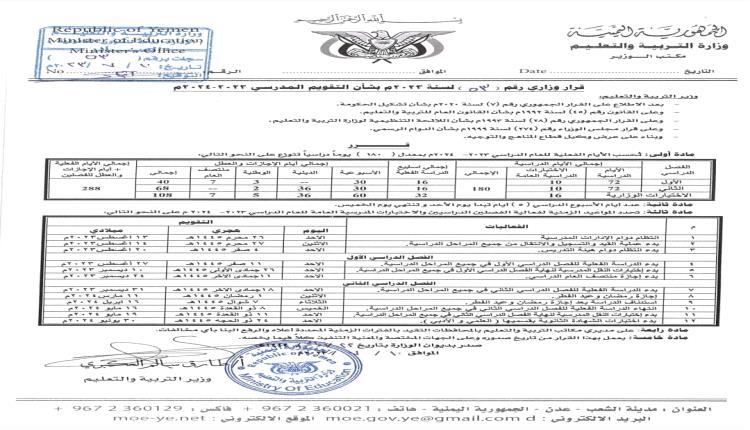 أعلنت وزارة التربية والتعليم القرار الوزاري رقم 53 لسنة 2023 بشأن التقويم المدرسي 2023 – 2024م.