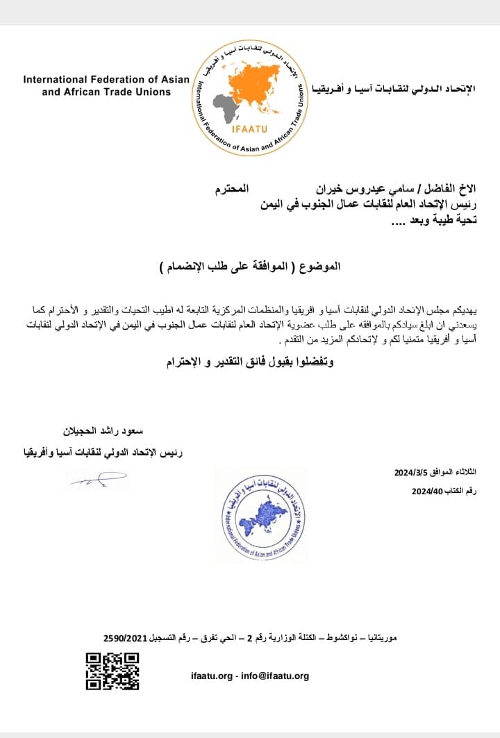 يهديكم مجلس الإتحاد الدولي لنقابات آسيا وافريقيا والمنظمات المركزية التابعة له اطيب التحيات والتقدير والاحترام كما يسعدني ان ابلغ سيادكم بالموافقة على طلب عضوية الإتحاد العام لنقابات عمال الجنوب في الإتحاد الدولي لنقابات آسيا وأفريقيا متمنيا لكم ولإتحادكم المزيد من التقدم .