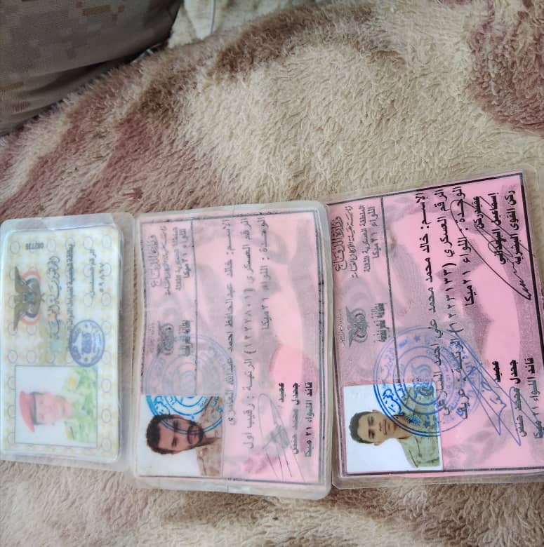 ووثقت المصادر صور للبطاقات الهوية التي يملكها الجنود والصف ضباط والضباط ينتمون لمليشيات الإخواني علي محسن الاحمر .