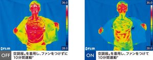 عندما يشعر دماغ الإنسان بارتفاع درجة الحرارة، فإنه يوجه الغدد العرقية إلى إفراز العرق الذي يبرد الجسم أثناء تبخره. هذا التعرق هو آلية تبريد الجسم الطبيعية. الملابس المكيفة، التي نشاهدها اليوم بشكل شائع في شوارع اليابان خلال أشهر الصيف الحارة، تزيد من تأثير التبريد هذا. تم تجهيز الجزء الخلفي من الملابس بمروحتين صغيرتين تسحب الهواء إلى الداخل وتنفخه عبر سطح الجسم ليتبخر العرق على الفور.
