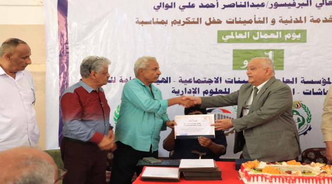 كرم وزير الخدمة المدنية والتأمينات البوفيسور عبدالناصر احمد الوالي اليوم في حفل تكريم أقامته الوزارة بالعاصمة عدن مجموعة من موظفي ديوان وزارة الخدمة المدنية والتأمينات والمؤسسة العامة للتأمينات الاجتماعية والهيئة العامة للتأمينات والمعاشات والمعهد الوطني للعلوم الادارية، بمناسبة يوم العمال العالمي الذي يصادف الأول من شهر مايو من كل عام.
