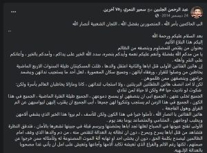 وسبق أن خاطب المذكور جلبين في منشورات سابقة على منصة الفيس بوك مليشيا الحوثي بمصطلح الحاكمين بأمر الله المنصورين بفضل الله اللجان الشعبية أنصار الله كونه خريج ساحات صنعاء اليمنية شهادة لجان شعبية حوثية يكافئ بتعيينه مدير مكتب رئيس قناة عدن الفضائية في الرياض ومذيعا في القناة منذ الاسبوع الفائت.