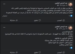 كما ظهر جلبين في منشورات على صفحته في الفيس بوك يشتم المملكة العربية السعودية البلد المضيف في صورة لا يرعى خلالها حسن كرم الاستقبال والوفادة ولا يبدي احتراما للبلد الذي آواه وأكرمه وينعتها باليهودية علنا في منشوراته ويقذفها بادعاءه أنها سبب انخفاض معدل الدخل في قطر عند ارتباطها بها وأن مرحلة ارتفاع معدل الدخل في قطر وتطورها جاء بعد أن خرجت من العباءة السعودية حسب زعمه كما يدافع جلبين عن مليشيا الحوثي واصفا السعودية بالعدو.