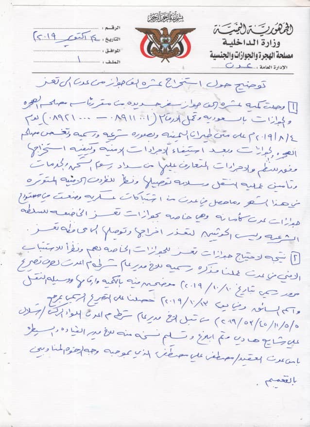 1- وصلت كمية 10 الف جواز سفر جديدة من مقر رئاسة مصلحة الهجرة والجوازات بالسعودية وتحمل الارقام ( 08911001 – 08921000 ) يوم 4 / 8/ 2019 م على متن طيران اليمنية وبصورة شرعية ورسمية وتخص مصلحة الهجرة والجوازات وبعد استيفاء الإجراءات الأمنية وكيفية استخراجها وفقا للنظم والاجراءات المتعارف عليها من سداد رسوم الشحنة والخدمات وتأمين عملية النقل وسلامة توصيلها ونظرا للظروف الأمنية المتوترة في هذا الشهر وما حصل في عدن من اشتباكات عسكرية وضعت في مستودع جوازات عدن كأمانة وهي خاصة بجوازات تعز الخاضعة للشرعية وليس للحوثيين لتعذر اخراجها وتوصيلها الى محافظة تعز .
