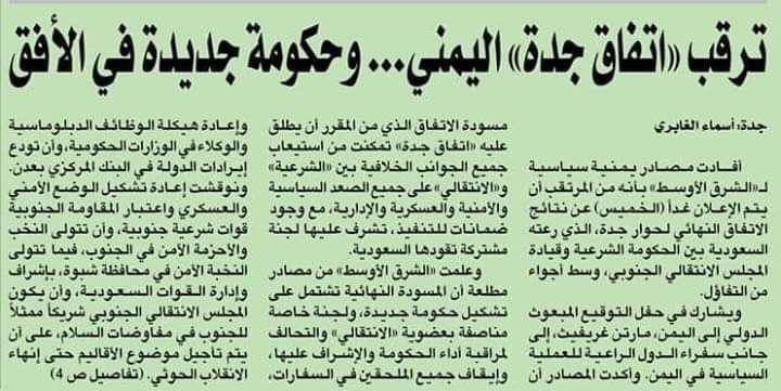 أفادت مصادر يمنية سياسية لـ«الشرق الأوسط» بأنه من المرتقب أن يتم الإعلان غدا الخميس عن نتائج الاتفاق النهائي لحوار جدة الذي رعته السعودية بين الحكومة الشرعية وقيادة المجلس الانتقالي الجنوبي.
