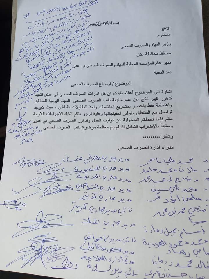 وجه مدراء إدراة الصرف الصحي عدن رسالة الى وزير المياه والصرف الصحي ، ومحافظ محافظة عدن ، ومدير عام المؤسسة المحلية والصرف الصحي في العاصمة عدن مطالبين من خلالها بتغير نائب مدير الصرف الصحي، وذالك بسبب عدم تفاعله مع مطالبهم في العمل وايضاً عدم تواجده الدائم في مكتبه.