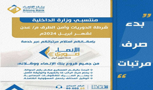 وتم تدشين صرف مرتبات شهر إبريل 2024 م عبر خدمة الانماء فوري من جميع فروع بنك الانماء ووكلائه.
