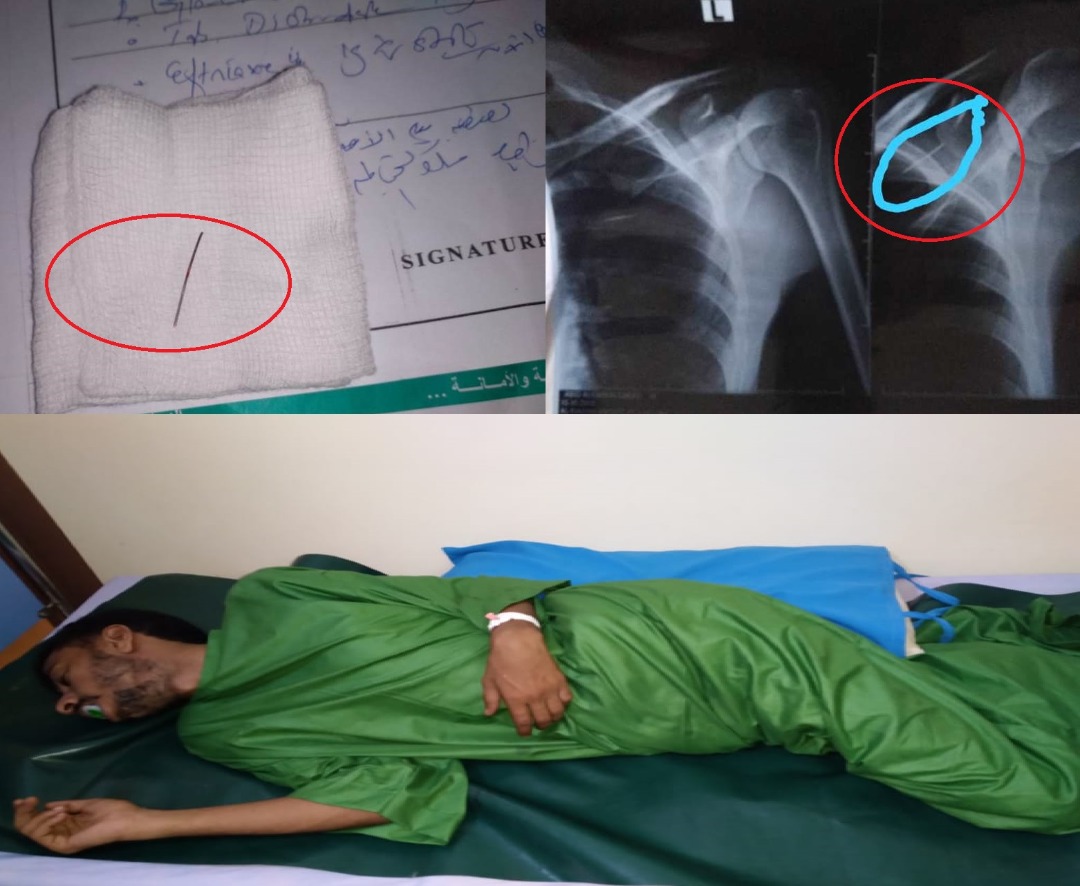 وأظهرت صور الاشعة التي أجريت للمعتقل ( الكربي ) وعليها سيخ حديد مغروس في ظهره على بعد سنتمترات من القلب، حيث ظل الالم يلازمه منذ هروبه من السجن في عزان حتى ظهر اجريت له العملية ظهر الأربعاء 16 /10/2019م وتم استخراج السيخ كما تظهر ذلك الصور.