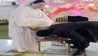 انتشر مقطع فيديو عبر مواقع التواصل الاجتماعي يُظهر شاباً مصرياً وهو يركع على الأرض ويقبّل قدم عروسته السورية خلال حفل زفافهما.