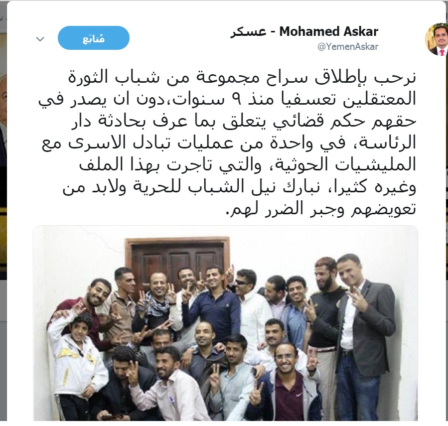 وبارك وزير حقوق الانسان اليمني المحسوب على شرعية الفنادق عملية الافراج التي قامت بها مليشيا الحوثي الارهابية واطلقت عناصر ارهابية نفذت التفجير وجميعها تنتمي لحزب الاصلاح ( اخوان اليمن) وذلك ضمن صفقة بين الاخوان وبين الحوثيين رعتها دويلة قطر .
