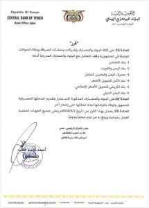 هذا وكان البنك المركزي قد أصدر قرار منذ شهرين بدعوة البنوك التجارية المعاملة في صنعاء ينقل مقراتها الرئيسية إلى العاصمة عدن، واعطى مهلة شهرين لهذه البنوك، واليوم بعد انقضاء المهلة تم إيقاف التعامل معها.