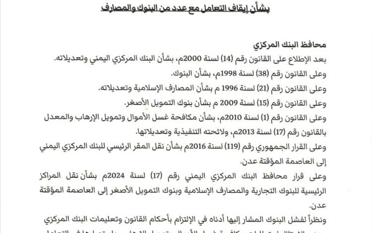 تعرّف على البنوك التي علّق البنك المركزي التعامل معها بسبب رفضها نقل مقراتها إلى عدن«وثائق»