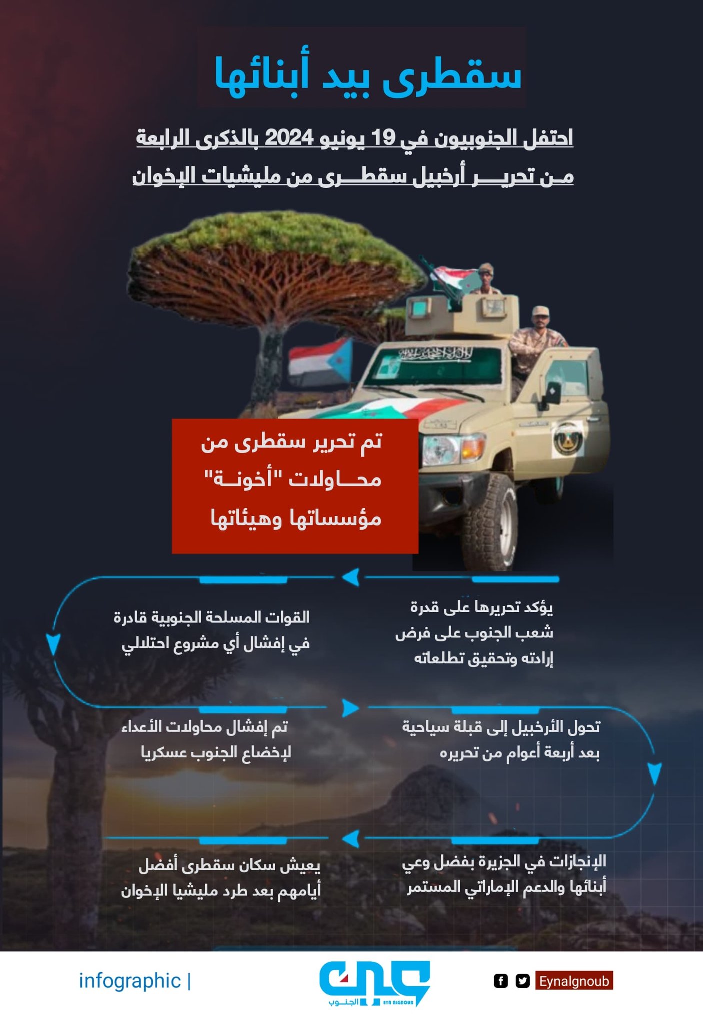 يمثل يوم ال 19 من يونيو، الذكرى الرابعة لتحرير جزيرة سقطرى، جوهرة بحر العرب، من قبضة مليشيات الإخوان . ويمثل هذا اليوم رمزًا لصمود الجنوب وإرادته القوية في الدفاع عن أرضه وسيادته، وانتصارا على قوى الظلم والاطهاد، اذ عانت سقطرى، منذ اجتياح مليشيات الإخوان لها من ويلات الظلم والاطهاد والممارسات القمعية، فقد سعت المليشيات إلى طمس هوية الجزيرة الجنوبية، وتضييق الخناق على أبنائها، في محاولة يائسة لإخضاعهم وإدراجهم ضمن مشروعها الفوضوي.