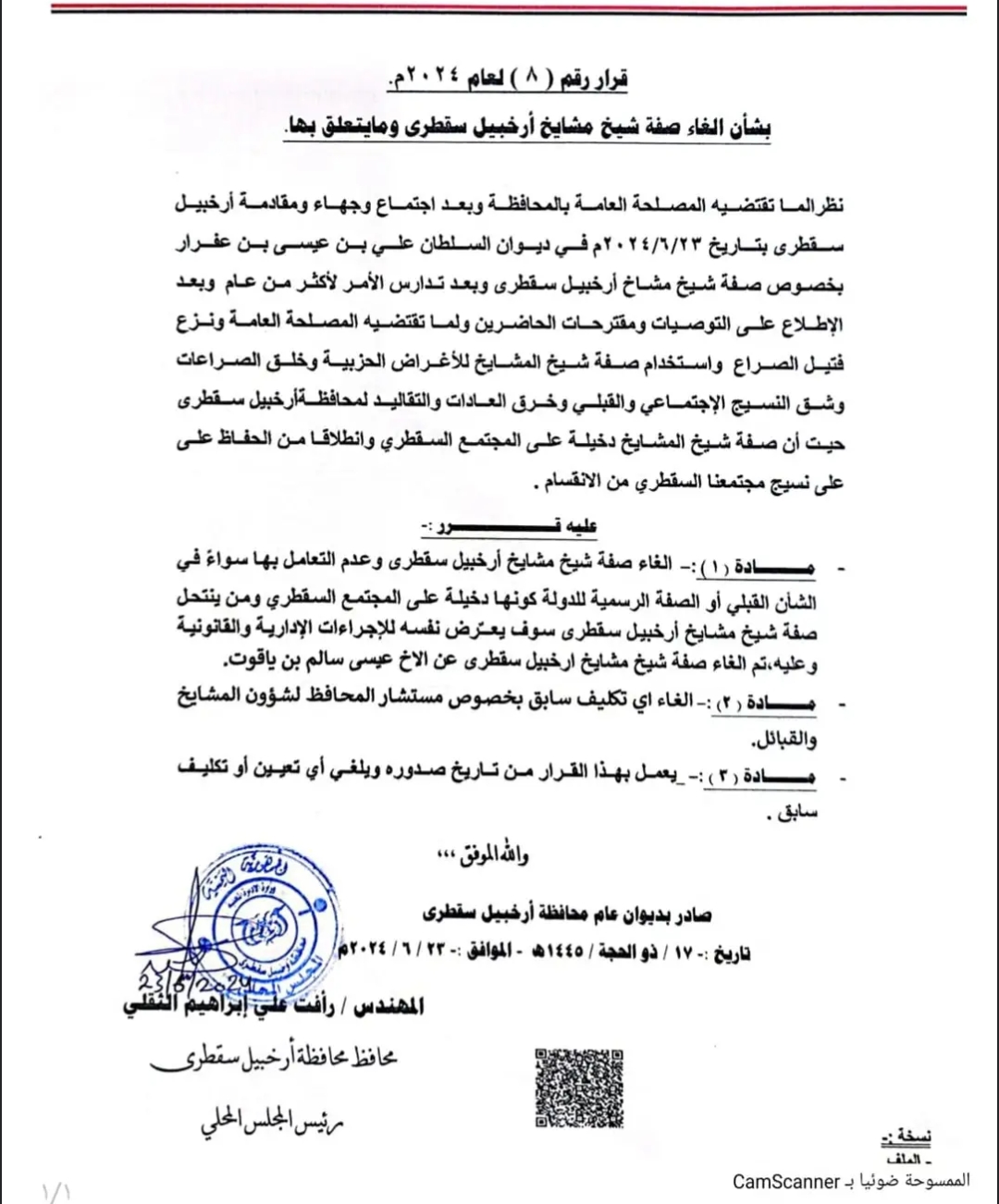تعرف على القرار رقم (8) الصادر من محافظ سقطرى