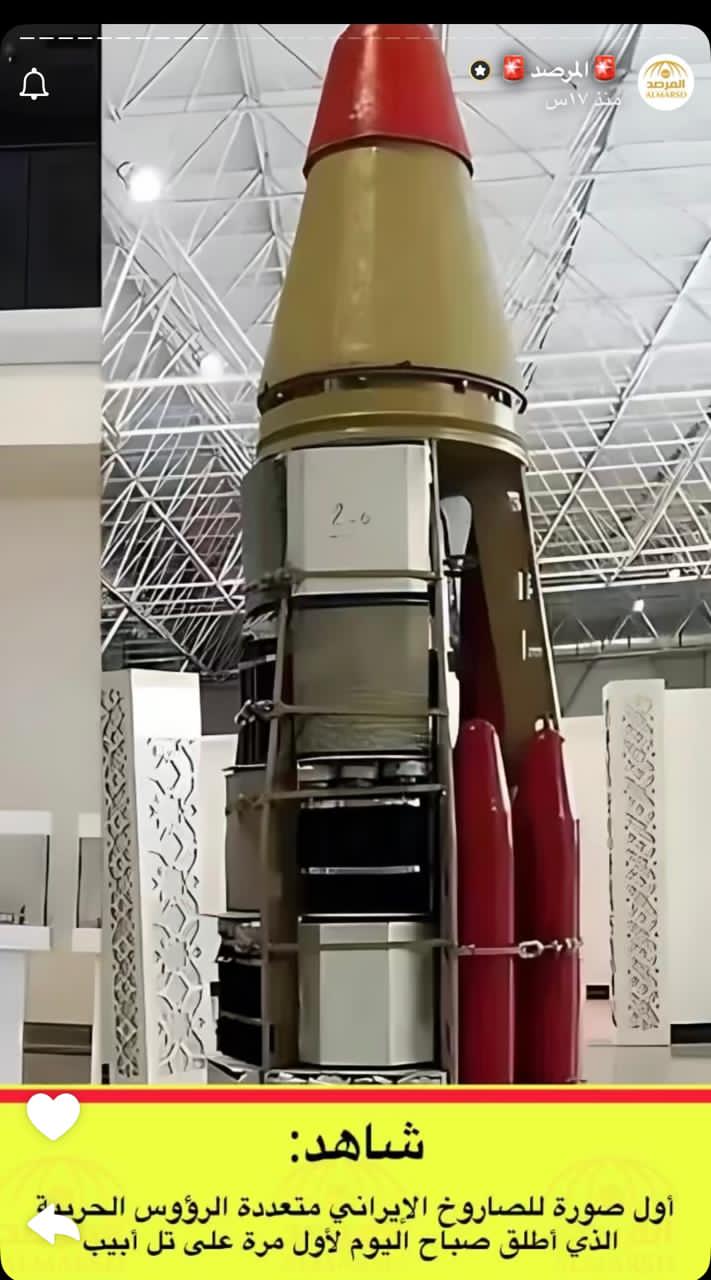 نشرته وسائل الإعلام المختلفة اول صورة للصاروخ الإيراني متعدد الرؤوس الذي أطلق صباح اليوم الجمعة الموافق 20/5/2025 على تل ابيب
