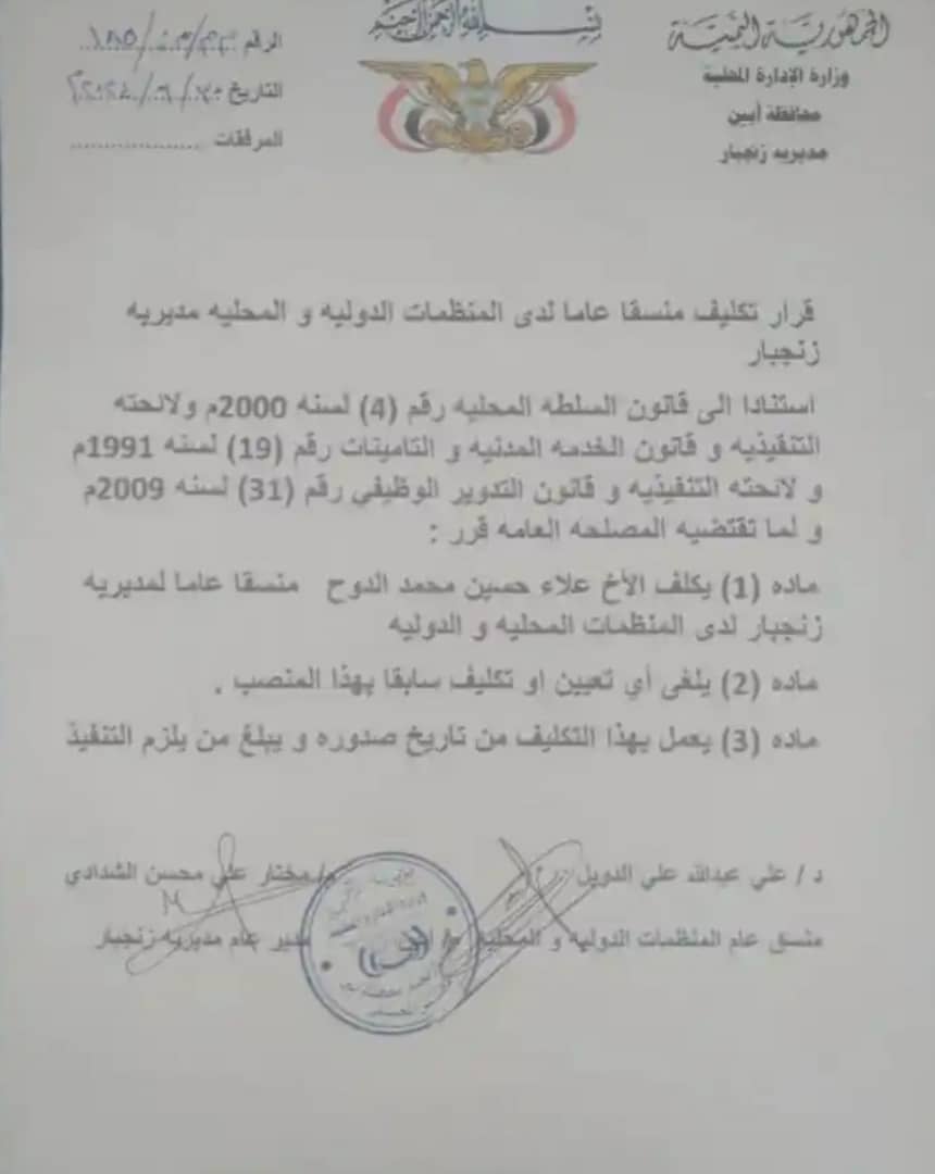 أصدر المنسق العام للمنظمات الدولية والمحلية بمحافظة أبين الدكتور علي عبدالله الدويل ومدير عام مديرية زنجبار المهندس مختار الشدادي قراراً بتكليف الشاب علاء حسين محمد الدوح منسقاً عاماً لمديرية زنجبار لدى المنظمات الدولية والمحلية بمديرية زنجبار.