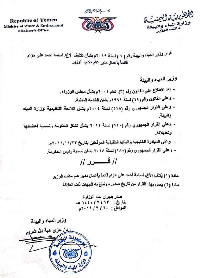 و تناقلت عدد من صفحات التواصل الاجتماعي منشورا للدكتور عزي شريم وزير المياه والبيئة الموقوف من قبل رئيس الوزراء معين عبدالملك مطالبا من خلاله النائب العام الدكتور علي الاعوش بالتحقيق في صحة شهادات جامعية مزورة أصدر على ضوئها تعيينات في حكومة معين عبدالملك ، وفي مقدمتها قرار تعين مدير عام مكتب وزير المياه نجيب الحميري ” .