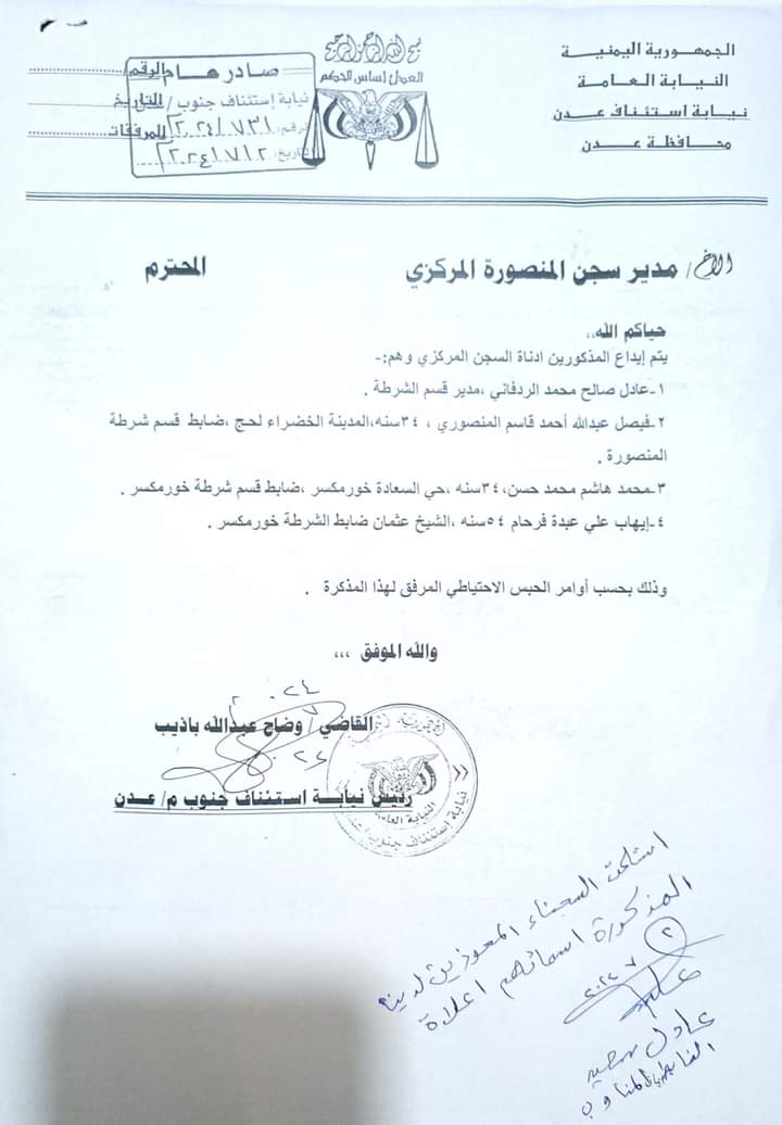 عدن لاصوت يعلو فوق القانون ..تفاصيل ايداع رئيس قسم شرطة خور مكسر و 4 افراد السجن المركزي بالعاصمة عدن