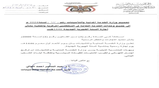جاء ذلك في تعميم صادر عن وزارة الخدمة المدنية والتأمينات رقم (١٣) لسنة ٢٠٢٤م الى جميع وحدات الخدمة العامة في السلطتين المركزية والمحلية بشأن اجازة السنة الهجرية الجديدة ١٤٤٦هـ.
