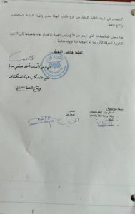 تهديكم أطيب تحياتنا مع تمنياتنا لكم بالتوفيق والنجاح في مهامكم… اشارة إلى الموضوع اعلاه … ونظراً لتحول رئيس النقابة لجمع توقيعات لرحيل مدير عام فرع مكتب الهيئة عدن من منصبه ، فأننا نحب الإشارة إلى بعض الاعتبارات القانونية في حق النقابة الحالية تأمل منكم النظر فيها وتوجيهها للمختصين في الشؤون القانونية ومنها: ا عدم قانونية بقاء رئيس النقابة في موضعه بعد إنتهاء فترة صلاحيته ولم يدعو إلى