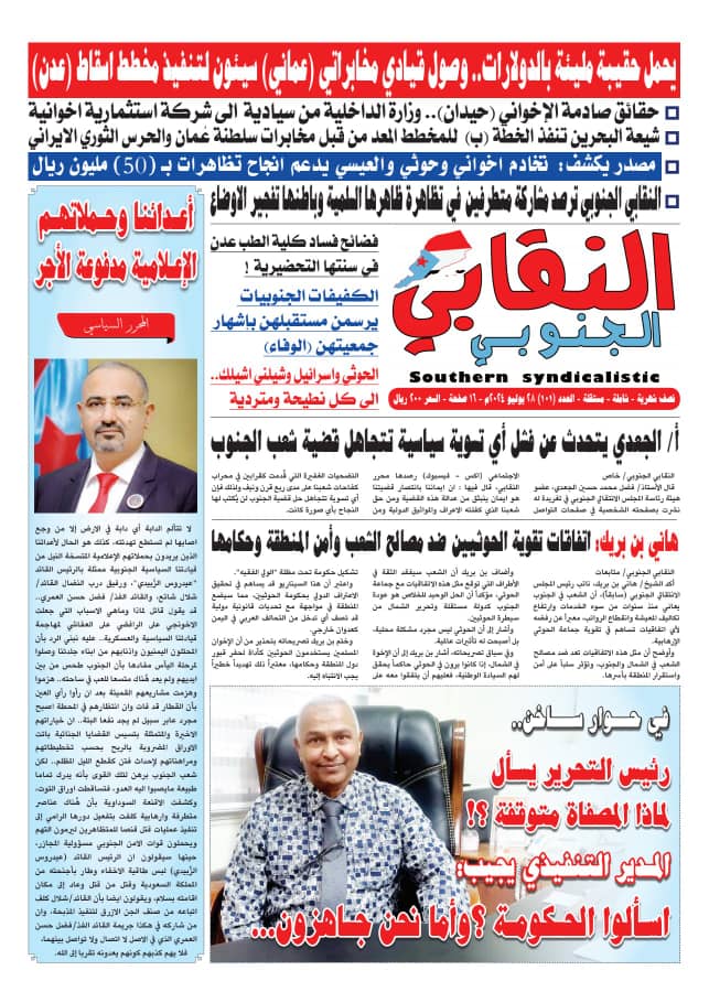 صحيفة النقابي الجنوبي في عددها الجديد (101) يوم غد الاحد الموافق 2024 / 7 / 28