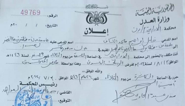 أصدرت المحكمة الإدارية بالعاصمة عدن اعلان الدعوى المقدمة من المدعي الأكاديمي بجامعة عدن خليل إبراهيم محمد الكاف ضد المدعى عليها جامعة عدن ممثلة برئيسها أ.د. الخضر ناصر لصور المعني بالحضور الى المحكمة للرد على حيثيات الدعوى يوم الثلاثاء 13 اغسطس.